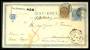 1875. Tofarvet, 16 Øre, grå/brun på 4 øre smalt helsagsbrevkort brugt som adressekort for en pakke fra FREDERIKSBERG, til Nørresundby. 1 Pund, 40 Qvint. Omadresseret til Frederikshavn, hvordor der er...