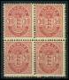 1884. 10 øre rød i 4-blok med stærkt forskudt vm. så de ses 2 halve kroner på alle 4 mærker, nedre venstre mærke med blyant nr. AFA (løse) 3000,-