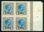1921. 1 kr. brun/blå i 4-blok med 2 postfriske. AFA 2100,-