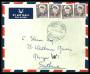 1950. Frederik IX, 25 Øre, rød og Gustav Holm, 50 Øre, blå. Luftpostbrev sendt fra KAP TOBIN TADIO i SCORESBYSUND 6.11.1957 via Mestervig og København til Angmagssalik. Transitstemplet GRØNLANDS POSTK...
