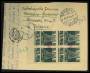 1945. Grunwald, 50 Groszy, mørkgrøn (4-blok). Rekommanderet brev sendt fra Warszawa til Geneve i Schweiz. Provisorisk håndskreven R-etikette. Transitstemplet ANKARA 24.3.1945. Åbnet af censuren i Egyp...