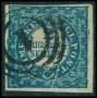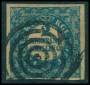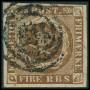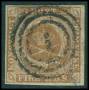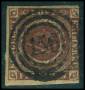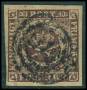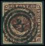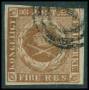 1853. 4 RBS mørk rødbrun med bred rand i venstre side med retvendt nr. stp. 1. 2 folder der ikke berører mærke.
