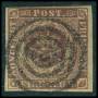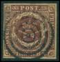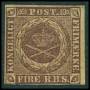 1853. 4 RBS mørk rødbrun, lidt tæt klippet i syd, sjældent postfrisk mærke. AFA 24000,-