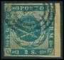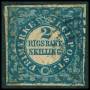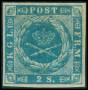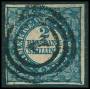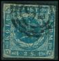 1852. 2 RBS blå Thiele pl. II-25 type 5, lille rift i N-margin der ikke berører mærkebilledet. Attest CAM.