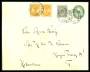 1902. Tofarvet, 3 Øre, blå/grå og Våbentype, 1 Øre, orange (par). Opfrankeret på helsagskonvolut, 5 Øre, grøn. Sendt fra Nykøbing til Frederiksberg. Annulleret med bureaustempel SKIVE-GYNGØRE 16.11. o...