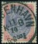 1875. 5 øre rød/blå med lille perlefejl.