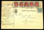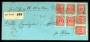 1875. Tofarvet, 8 Øre, 16. Tryk (3-stribe og 2 parstykker). I alt 56 øre på pakkeledsagebrev sendt fra BÆLUM 26.11. til Hobro. Annulleret med nummerstempel 129. Sjælden forsendelse med svag vandret fo...
