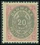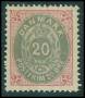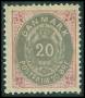 1875. 20 øre rød/grå med variant: Farveløs streg i ovalbånd over øre.
