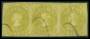 CHILE. 1862. 1 c. gulgrøn i 3-stribe, et mærke med fejl blækannulleret. Mi. 150 €
