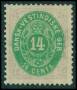 1873. 14 c. lilla/grøn med svag vandret gummifold (ikke nævnt i attest). Attest Grønlund. AFA 15000,-