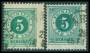 1877. 5 øre grøn. 2 forskellige nuancer med samme variant: Streg til venstre for 5. Facit (30v4)