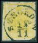 1850. 1 kr. gul på håndgjort papir. AFA 1000,-
