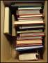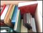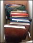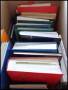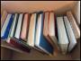 Flyttekasse med ca. 19 bøger (mange pæne med sorte sider) samt nogle årsmapper fra 1990erne-00erne.