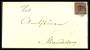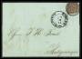 1853. 4 RBS mørk rødbrun pl. I-1: Hak i nø-kvadrat, tangeret på 2 sider på brev fra Altona til Kiel, indv. dateret 21.10.1853.