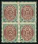 1895. 12 øre grå/rødlilla i 4-blok, stor farveplet over MA i NØ mærke (hængslet), 2 postfriske.
