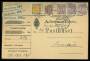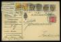 1895. Tofarvet, 100 Øre, grå/gul, 7.tr. (par), 16 Øre, grå/brun (4-stribe), 8 Øre, grå/rød på Adressebrev for 3 pakker 17, 19½ og 19 pund sendt fra København, 12.5.1902 til Fredericia. Porto grundtak...