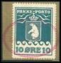 1937. 10 øre grønblå på klip med rødt ovalt stp. Udstedet Narssak.