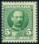 1907. 5 øre grøn med variant: Uskraveret til venstre for monogrammet. AFA 4.500,-