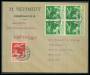 1929. 50 øre grå i lodret 3-stribe (nedre mærke med nogle korte takker) 10 øre grøn i par med varianter: Sten under plov og uden plet på baglår påluftpostbrev sendt til Singapore. Attest LN.